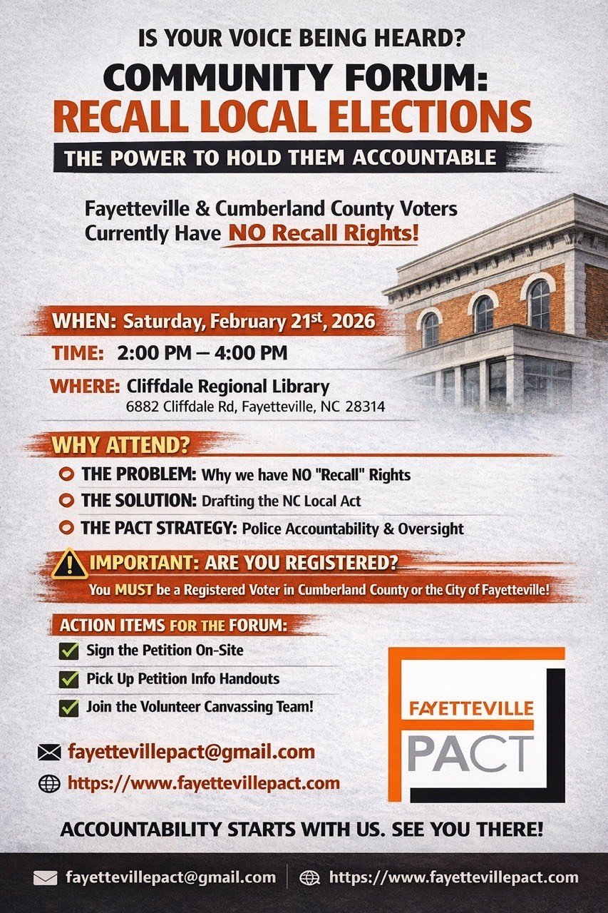 Events Please check here frequently for upcoming events! Read More Request to Add Recall Provision to Fayetteville City Charter Past Events Read More upcoming News
